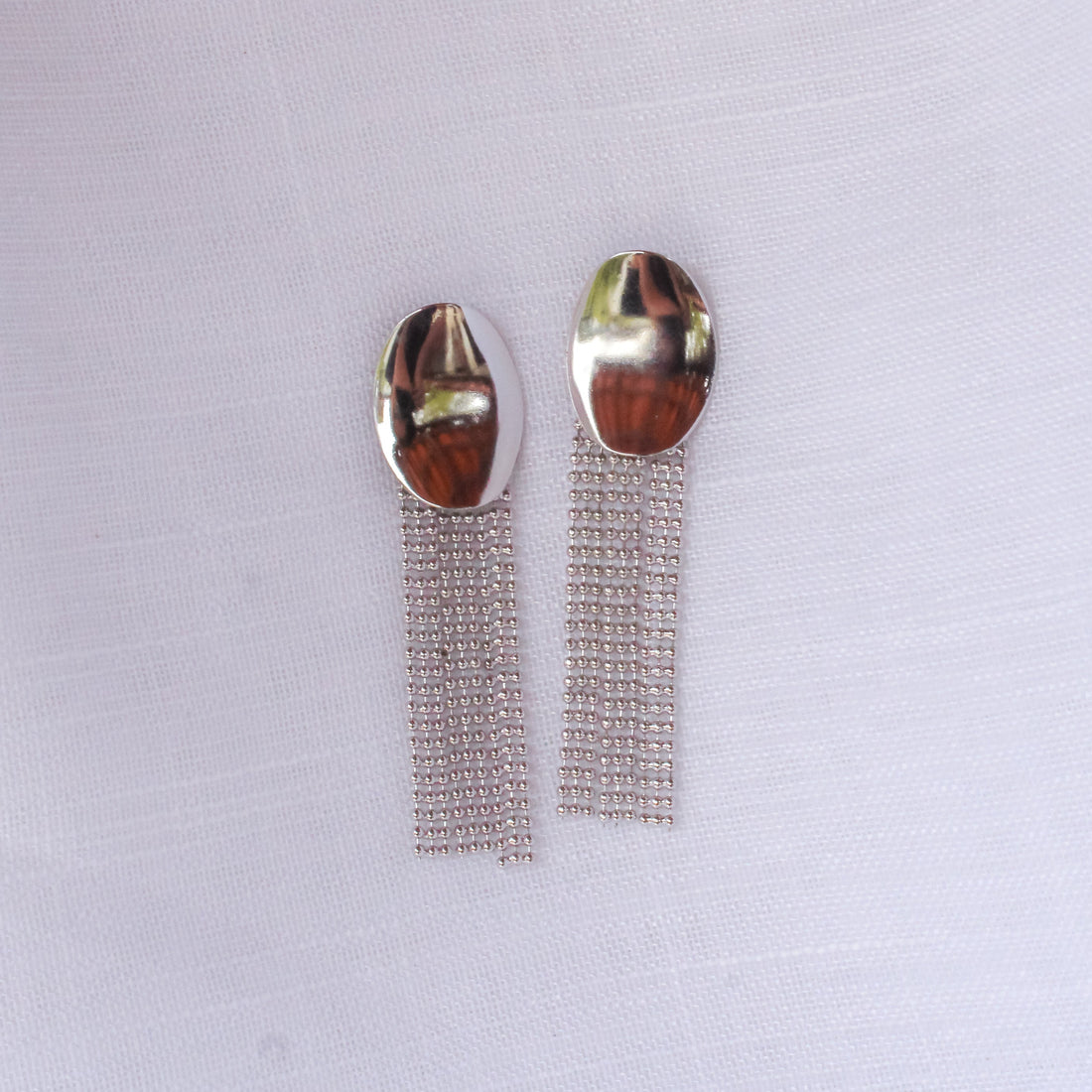 Brinco Chapa Oval com Franjas prateadas Elegância em movimento! Este brinco apresenta uma chapa oval...